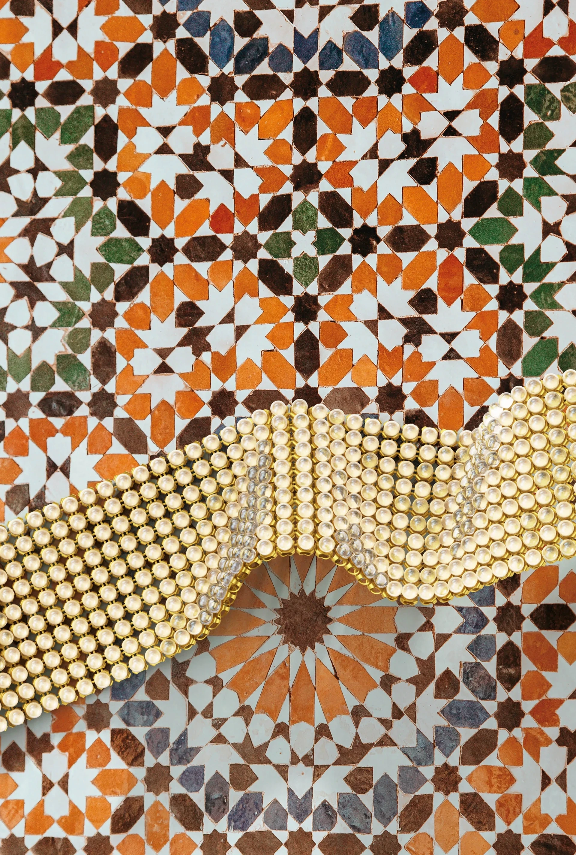 Ornate cross-cultural patterns ripple in rich zigzags of earth-toned crystals, centered by a band of natural fibers studded with Fancy Stones. A celebration of ancient craftsmanship, the design stands as a luminous testament to shared heritage – where artistry and tradition converge in enduring elegance.