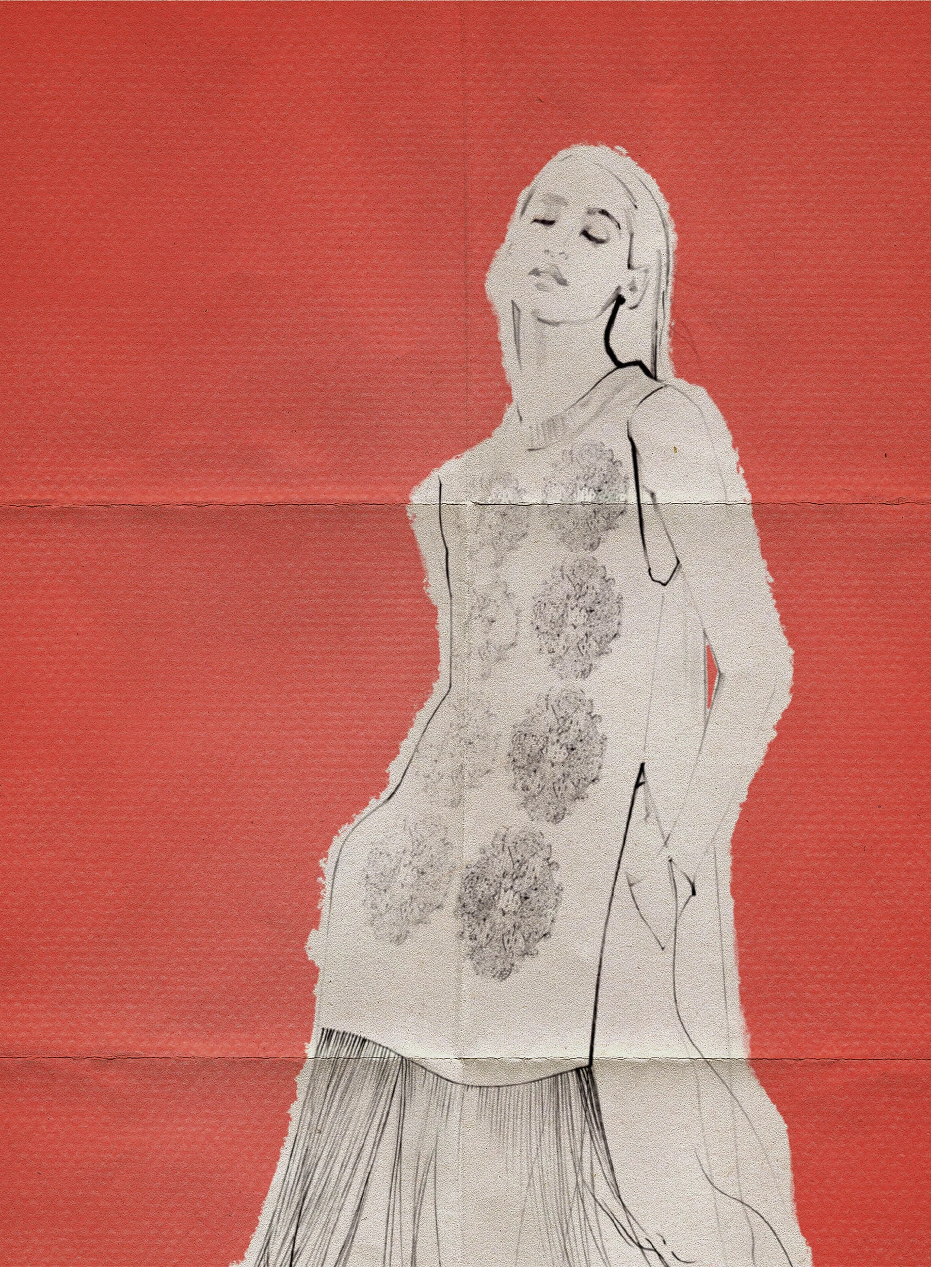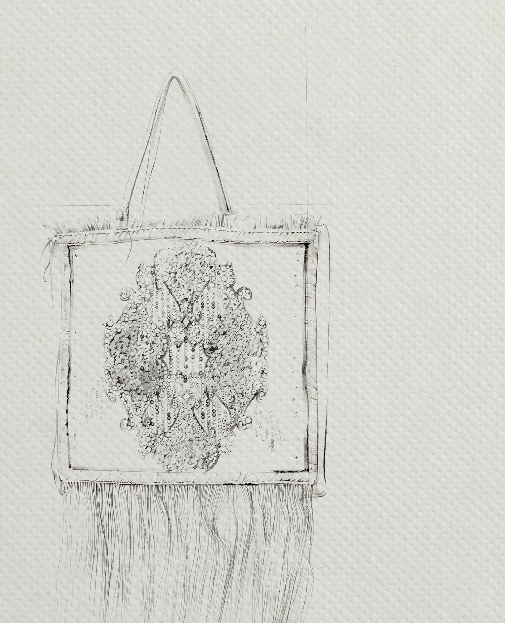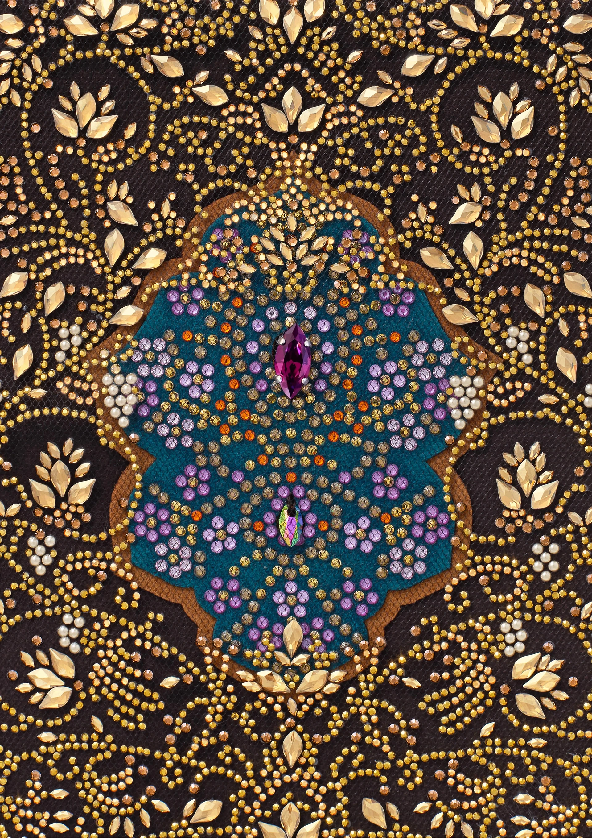 With a simple fold and a few clever ties, the same ornately adorned fabric seamlessly adjusts into a striking bag. Using the fringe as a luxurious base, the crystals form the body of the bag, finished with a precise fold-over flap, creating a piece rich with decadent flair.