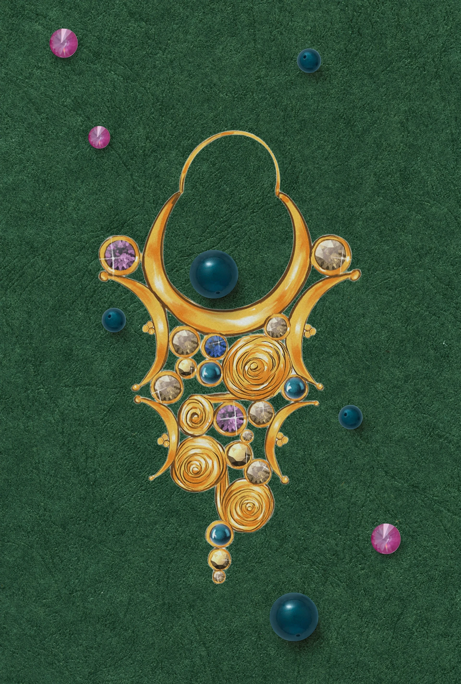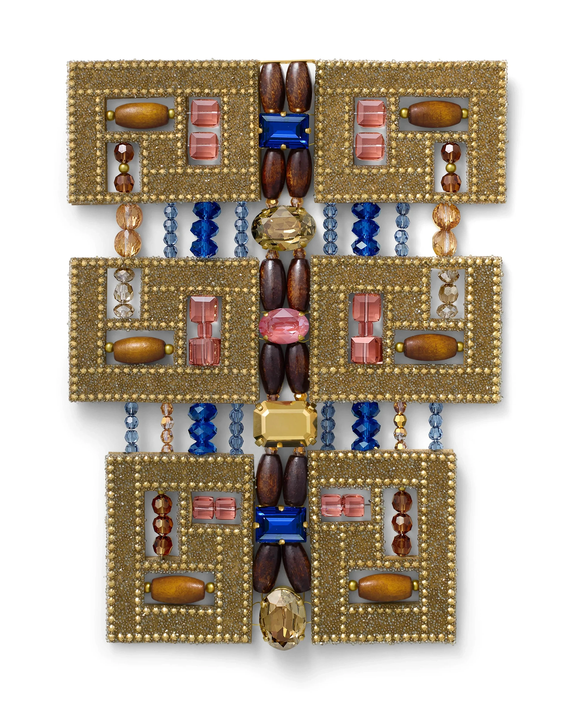 Joined squares of Crystal Intarsia with Crystal Aurum and Crystal Fabric in Crystal Bronze punctuate cut-out centerpieces, accented with wooden beads, Crystal Gold Pearls, and Fancy Stones. Highlighting cultural nuance, the interplay of color, texture, and symbolism weaves a storytelling tapestry, creating a bold neckpiece rich with archival inspiration.