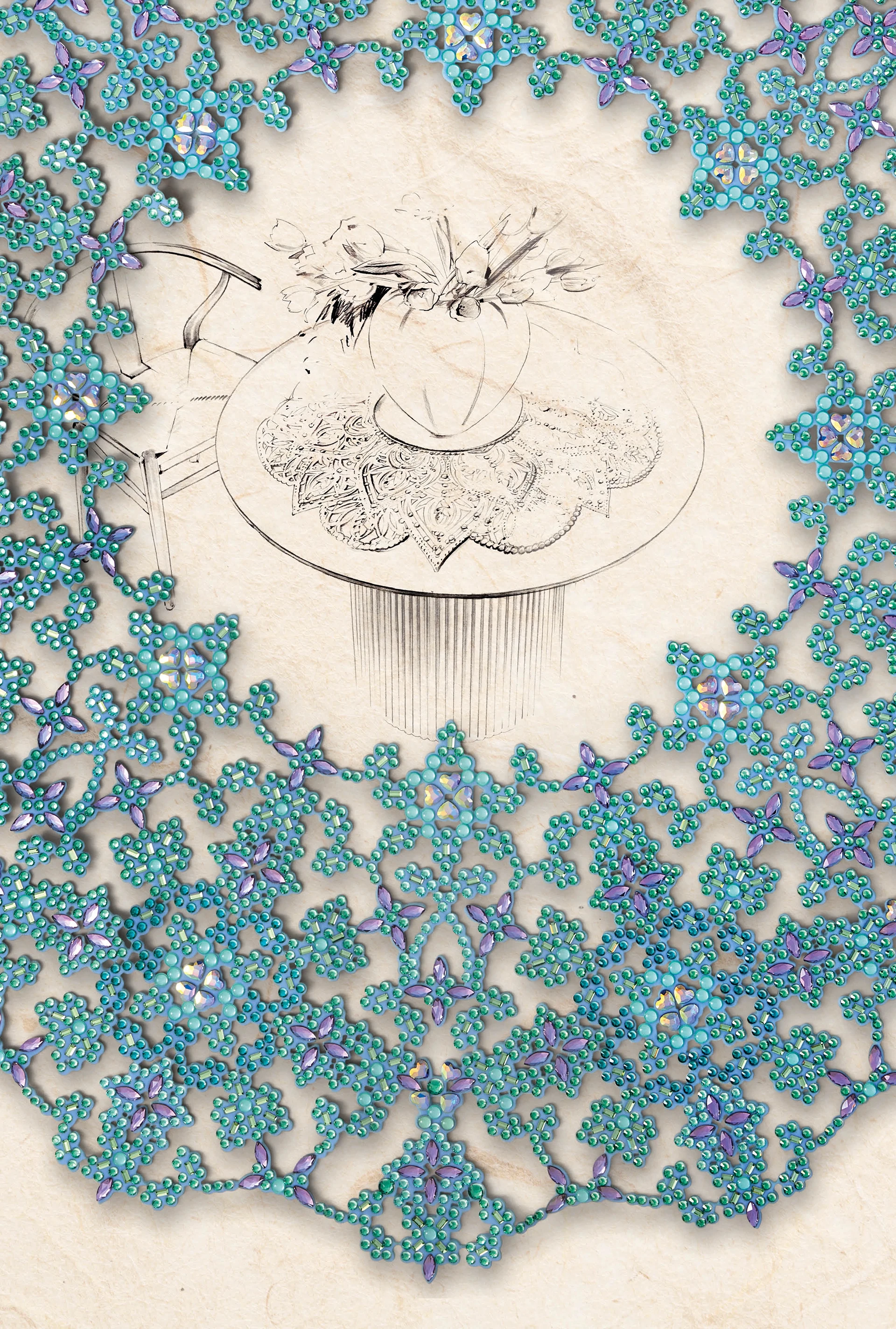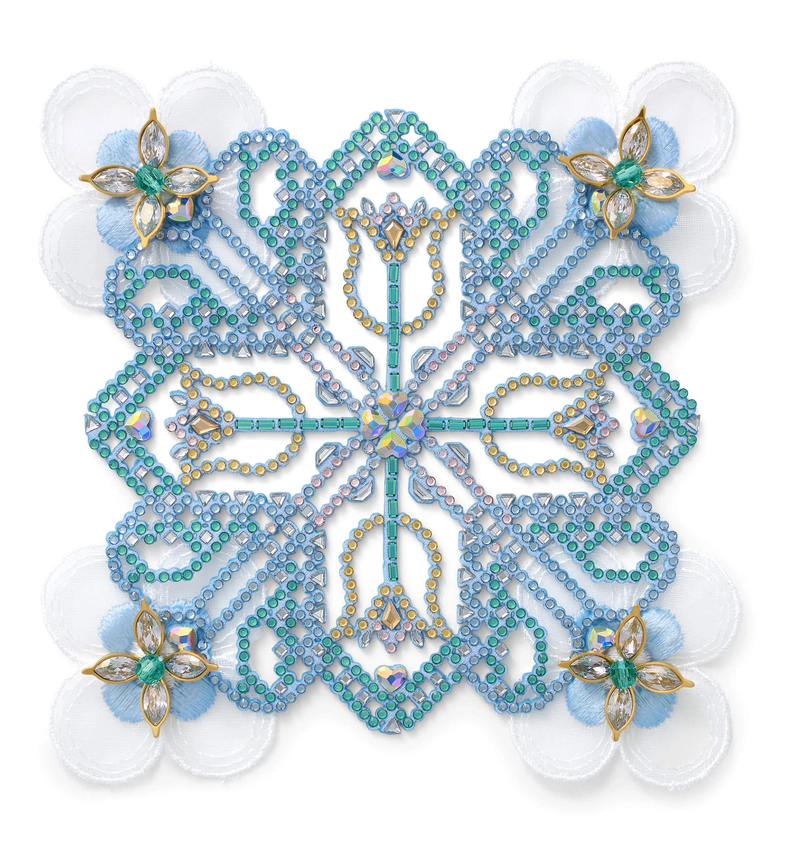 Imbued with subtle elegance, handcrafted Crystal Transfers of floral symmetry evoke a sense of nostalgia. Swarovski ReCreated™ Caribbean Green emerges in striking relief through an authentic devoré technique, with petals of Marquise Fancy Stones shimmering with beaded centers, against a sheer backdrop.