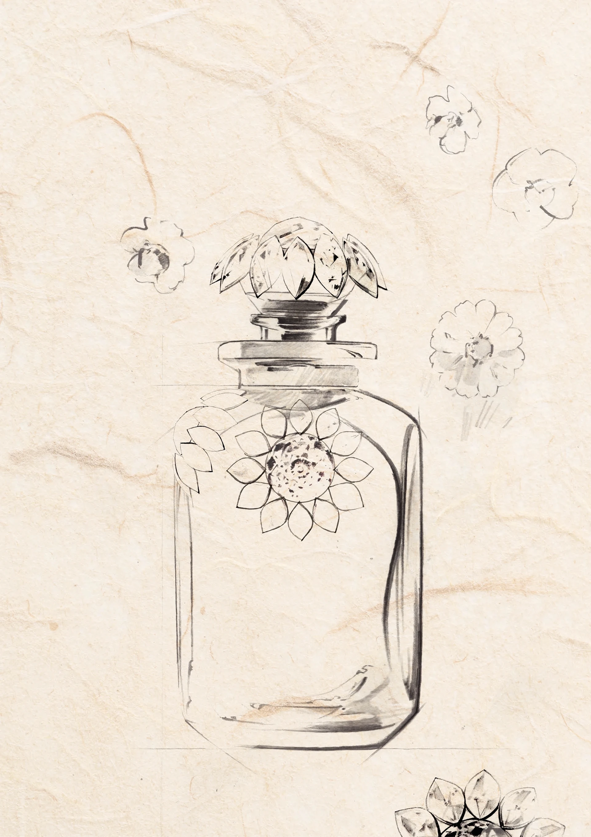 A large Dome Round Stone serves as the mesmerizing centerpiece for a flourishing array of Marquise Fancy Stones cast in radiant blooms. This lively and versatile design beautifully crowns the top of a perfume bottle.