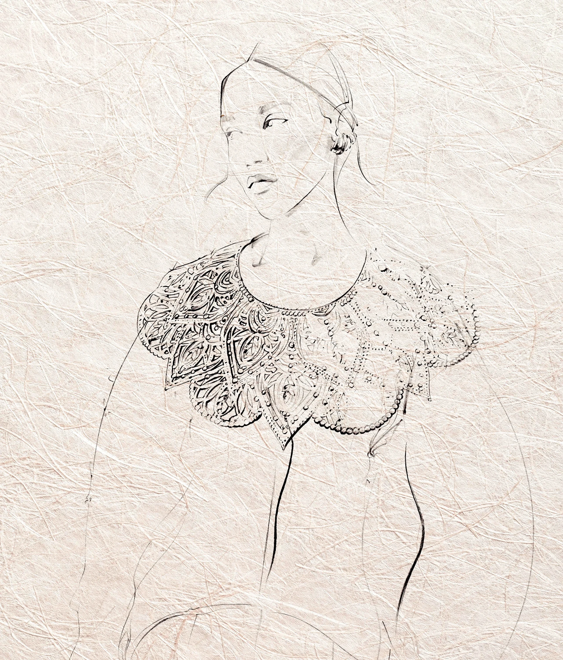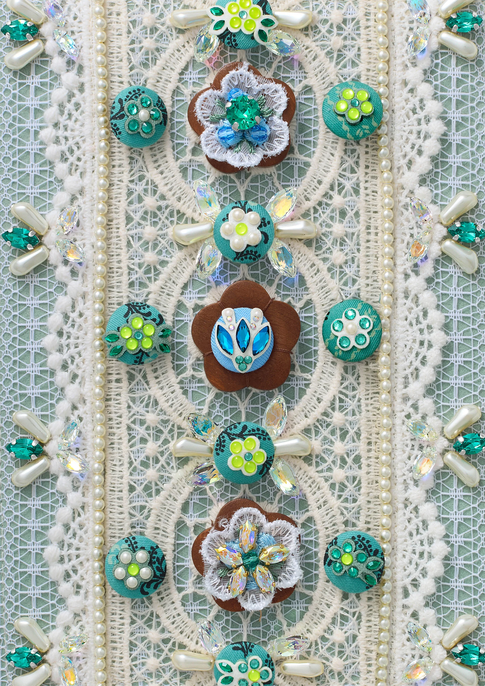 Blending traditional techniques with modern sensibility, a wide band of lacework centers a design rich with folkloric charm. Wooden buttons crowned with radiant blossoms, Crystal Baroque Pearls adding sculptural interest, and Marquise Cut Pendants forming glimmering leaves, come together in a comforting celebration of timeless creativity.