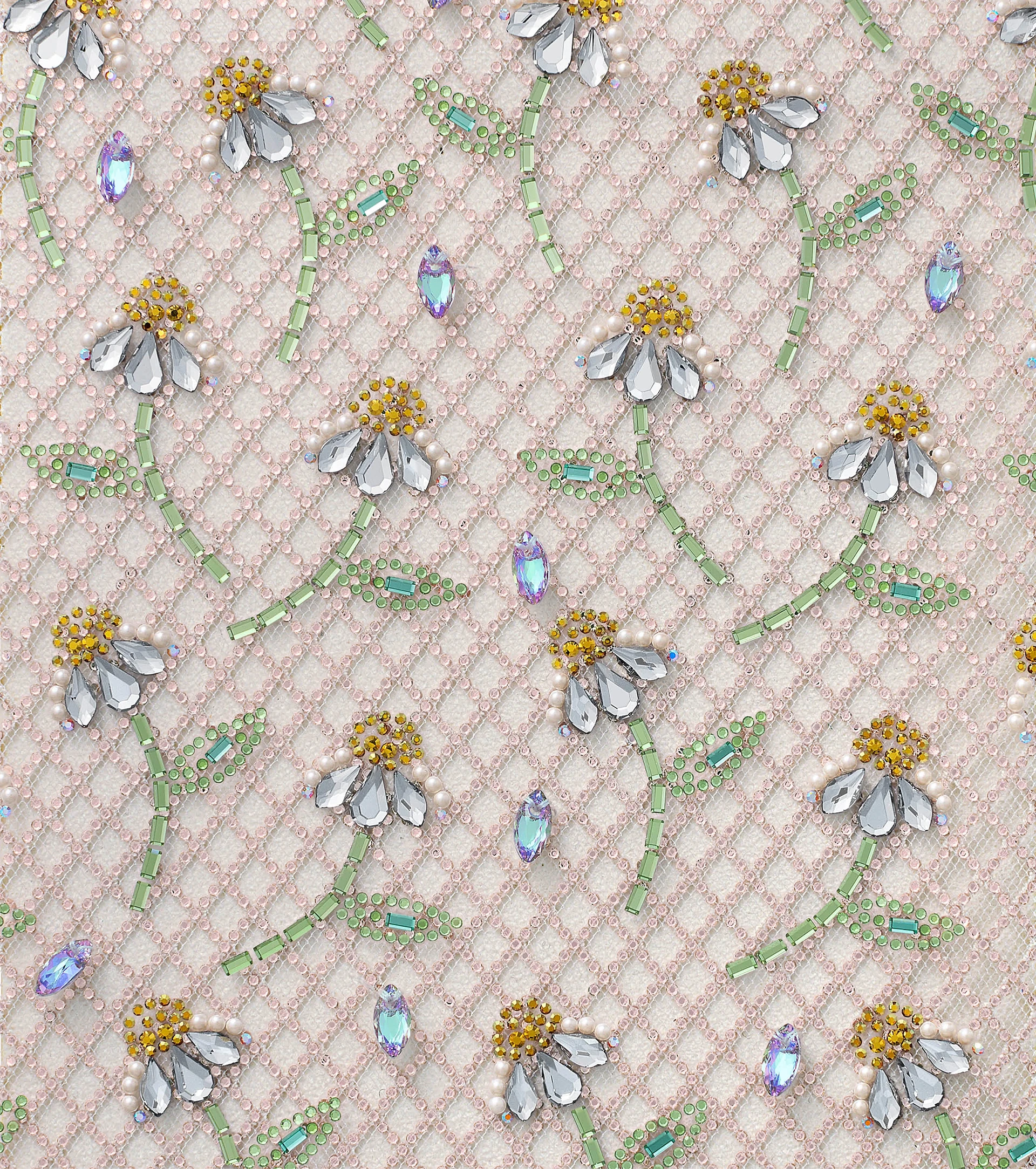 Falling flowers drift gently across a design of pure whimsy. Marquise Cut Pendants and tiny Crystal Pearls blossoms float over a delicate, transparent overlay, backed by a glimmering Crystal Transfer grid of stretch netting. Crafting a sense of storybook wonder, imagination wanders freely among the flowers in this delicate design.