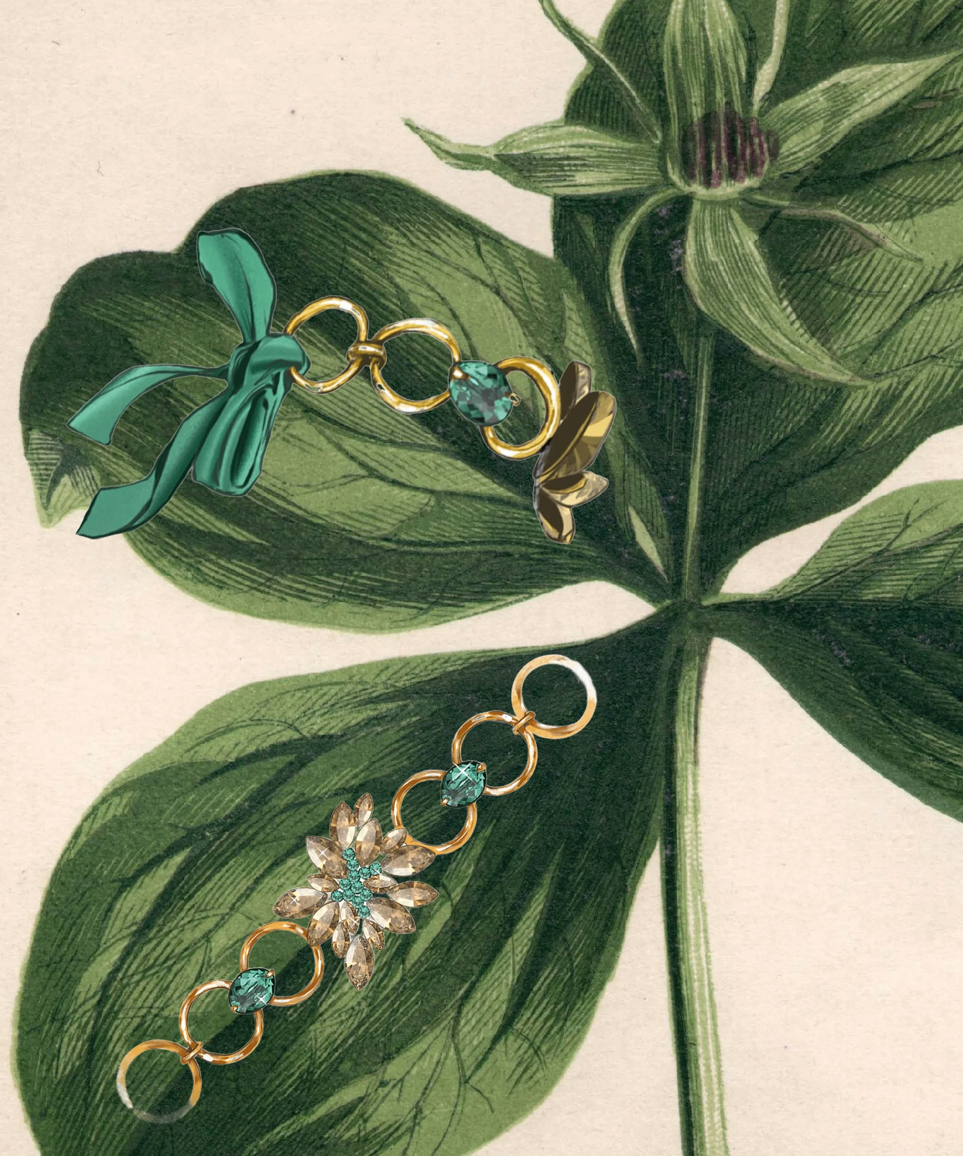 A silk ribbon weaves through golden links, connected with Oval Fancy Stones in Swarovski ReCreated™ Caribbean Green. Crowned with a whimsical floral bloom of Navette Fancy Stones in Crystal Golden Shadow and a Swarovski ReCreated™ Caribbean Green center, the bracelet radiates with the spirit of renewal.